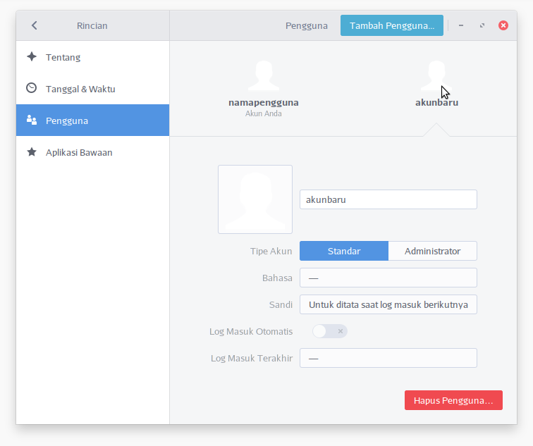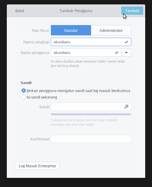 Untuk menambahkan akun, klik tombol Tambah Pengguna ... dipojok kanan atas. Pilih tipe akun (satndar atau administrator), nama lengkap dan nama pengguna dan atur sandi, kemudian klik tombol Tambah.