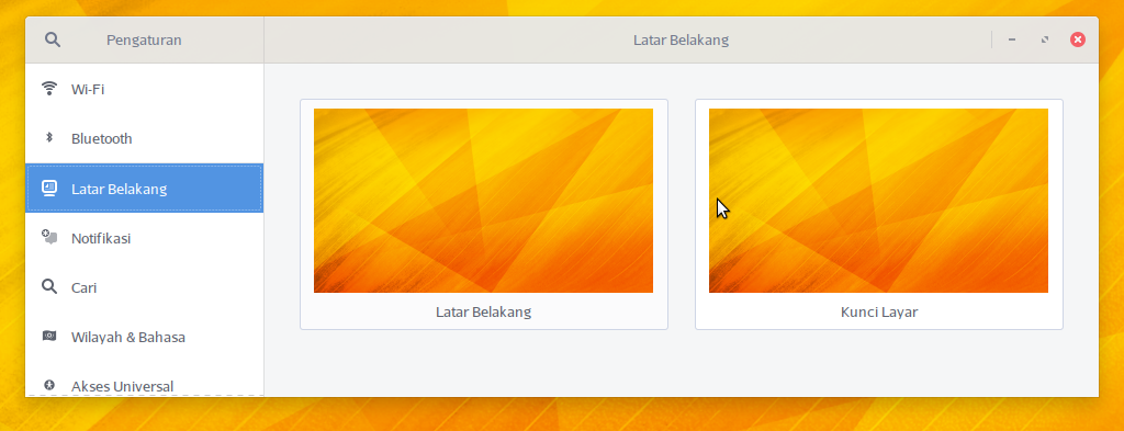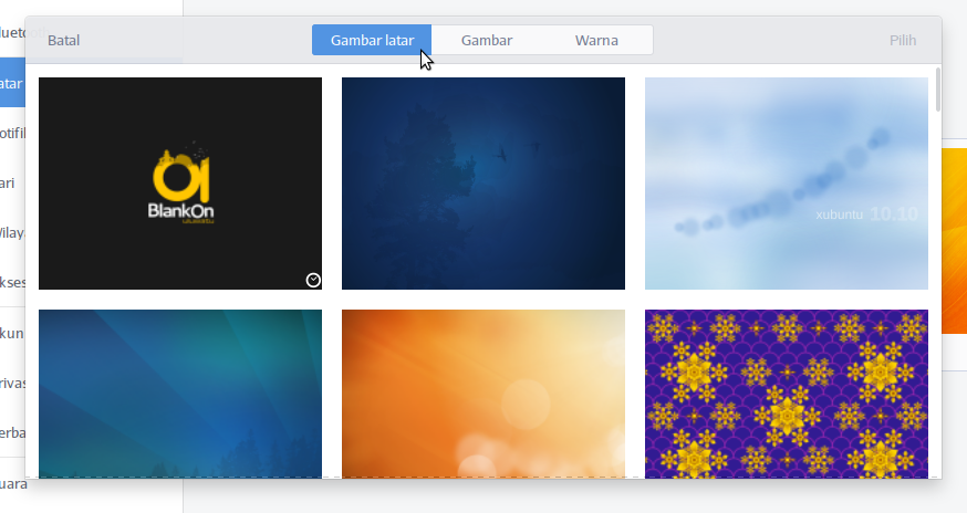 Untuk mengganti gambar Latar belakang dengan gambar tertentu yang sudah disediakan secara baku oleh BlankOn, klik Pengaturan => Latar Belakang, maka otomatis tampil jendela untuk mengatur Latar Belakang. Ada 2 (dua) menu, yaitu; Latar Belakang (background) dan Kunci Layar (lockscreen). Latar Belakang digunakan untuk mengatur gambar latar belakang pada destop, sedangkan Kunci Layar digunakan untuk mengatur gambar latar belakang ketika Anda mengunci komputer.