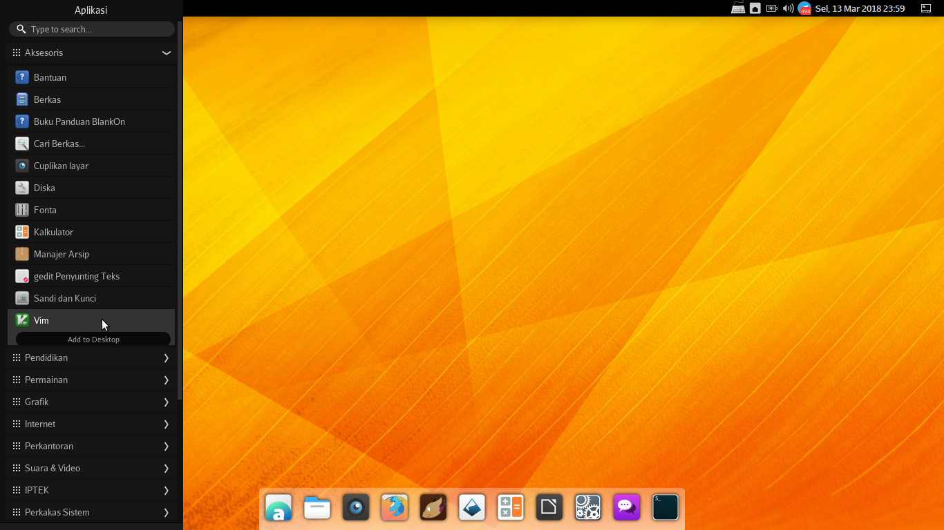 Anda dapat menambah aplikasi yang sering digunakan pada Menu Favorit di destop sesuai dengan keinginan dengan cara klik kanan pada nama aplikasi pada panel kiri. Misalnya kita ingin menambakan aplikasi Vim pada Menu Favorit, klik menu utama BlakOn => Aksesoris , kemudian klik kanan pada label Vim, kemudian klik Add to Desktop.