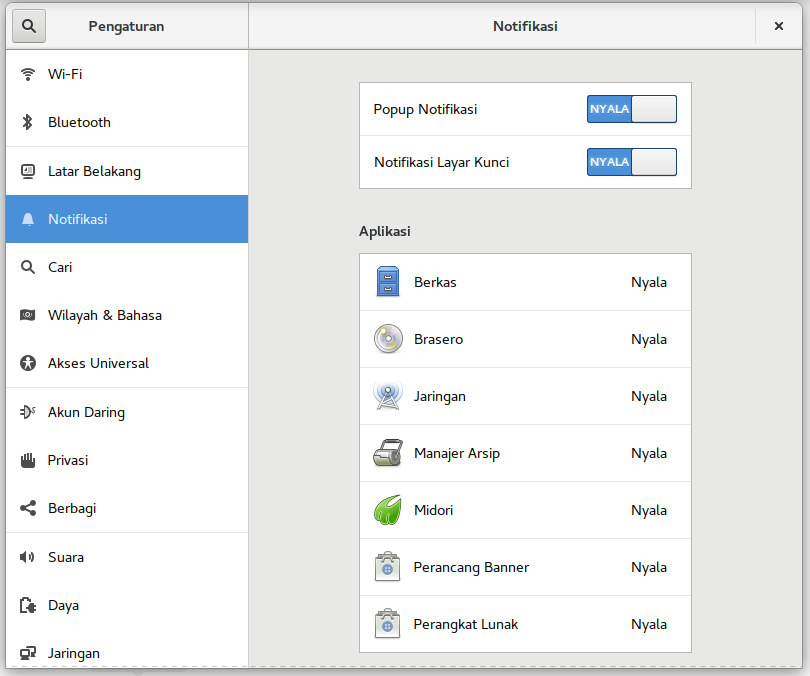 Jika notifikasi dimatikan, maka notifikasi tidak muncul pada bagian atas layar, akan tetapi tetap terbuka jika Anda mengeklik bagian jam.