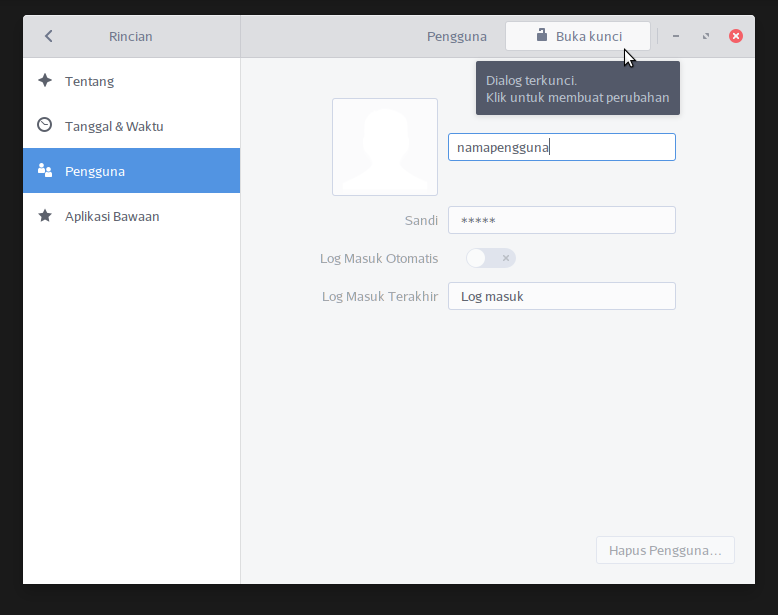 Untuk melakukan pengaturan informasi pribadi seperti nama, foto, kata sandi dan sebagainya untuk disimpan oleh sistem, Anda bisa membuka pengaturannya dengan klik Pengaturan => rincian => Pengguna. Sebelum melakukan pengaturan Anda harus Membuka Kunci dengan cara klik tombol Buka Kunci. Masukkan sandi Administrator untuk pembukaan kunci tersebut.