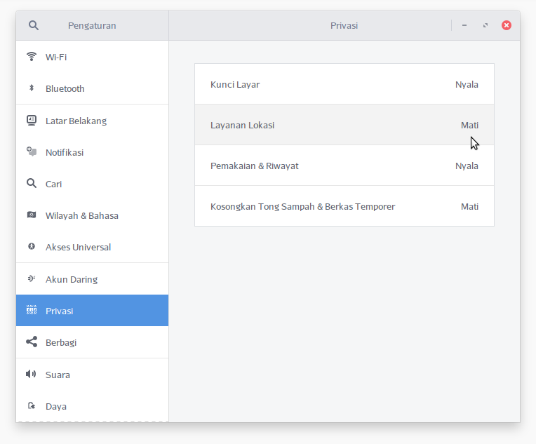 Privasi digunakan untuk mematikan atau menyalakan beberapa fitur; Kunci Layar, Layanan Lokasi, Pemakaian & Riwayat dan Kosongkan Tong Sampah & Berkas Temporer. Untuk mengatur fitur privasi klik Menu Utama BlankOn => Pengaturan => Privasi.