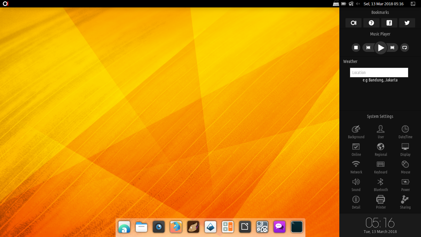 Menu Place and settings berisi Locations dan Pengaturan. **Locations ** untuk membuka folder Beranda/Rumah, Desktop, Dokumen, Unduhan, Musik, Gambar, Publik, Templates atau Video. Adapun Pengaturan digunakan untuk melakukan pengaturan destop sistem.