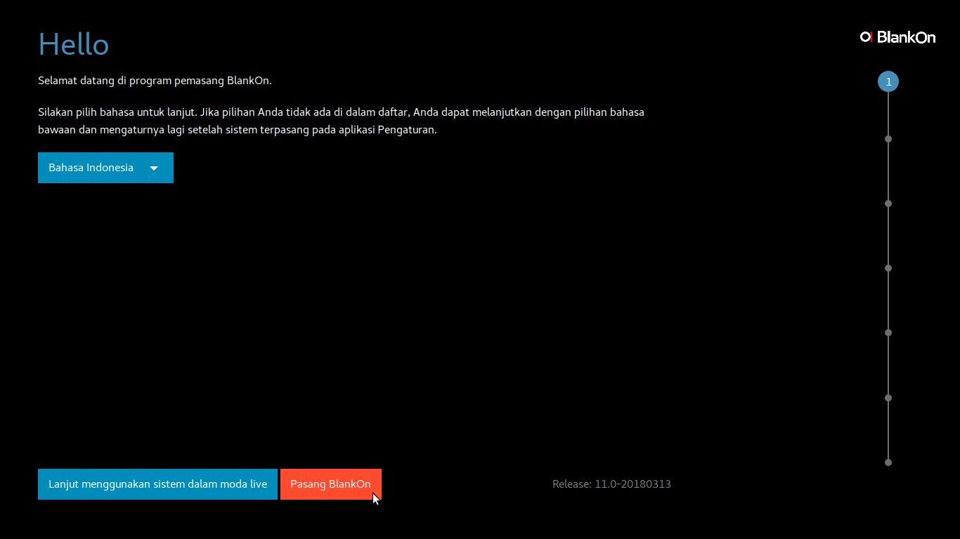 Secara baku BlankOn XI Uluwatu menyediakan dua bahasa ketika akan melakukan pemasang, yaitu Bahasa Inggris dan Bahasa Indonesia. Pilih bahasa yang sesuai, dalam buku Panduan ini menggunakan Antarmuka Bahasa Indonesia.