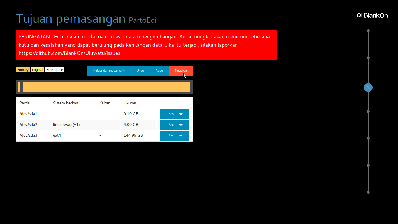 Jika media simpan di komputer yang akan dipasang BlankOn XI Uluwatu sudah tersedia partisi kosong langsung pilih Pasang BlankOn.
