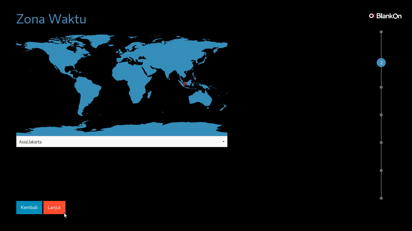 Beberapa saat setelah Anda menekan tombol Pasang BlankOn, maka tampil jendela untuk memilih Zona Waktu sesuai tempat Anda berada. Contoh, pilih Asia/Jakarta, klik tombol Lanjut untuk menuju proses berikutnya.