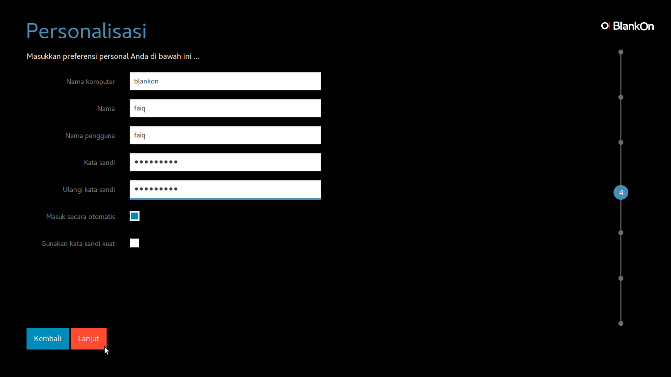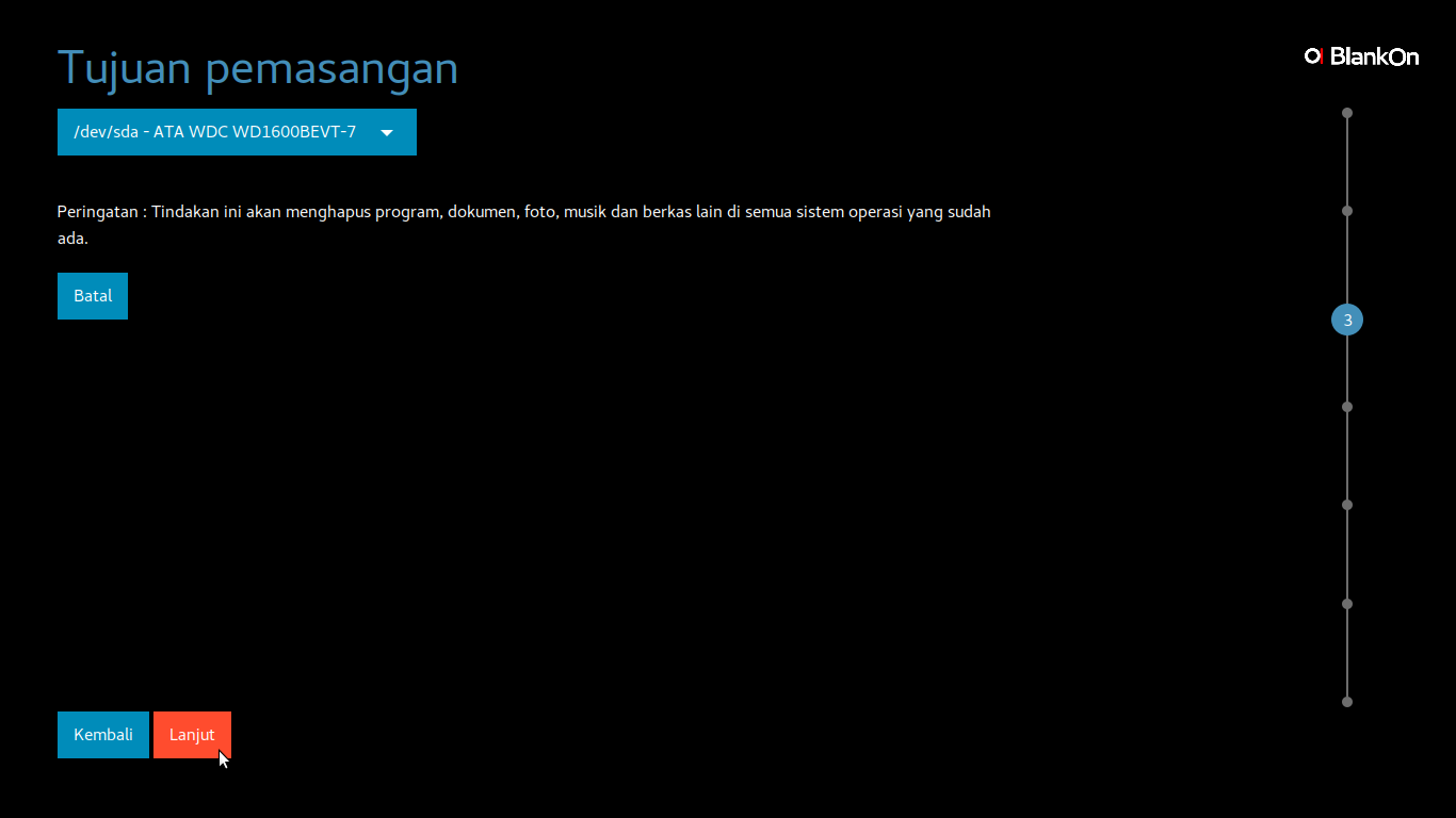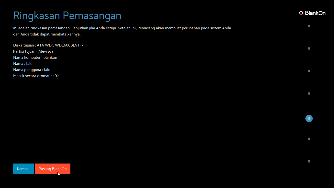 - Jika Anda masih ragu untuk melanjutkan ke proses berikutnya tekan tombol Kembali untuk menyunting/*mengedit informasi pada komputer yang akan dipasang BlankOn.