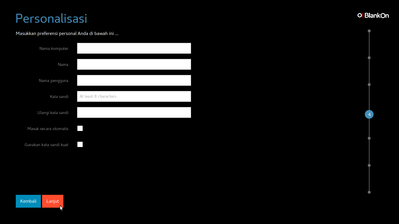 Masukkan informasi tentang nama komputer, nama pengguna serta password/kata sandi pengguna. Ketik beberapa informasi tersebut pada kotak yang tersedia. Jika ketika Anda ingin masuk ke destop tanpa harus memasukkan kata sandi,klik dan beri tanda pada kotak di samping kiri Masuk secara otomatis. Klik tombol Lanjut untuk melanjutkan ke langkah berikutnya.