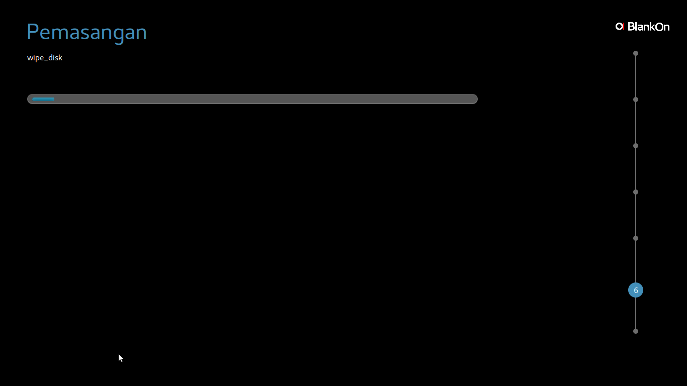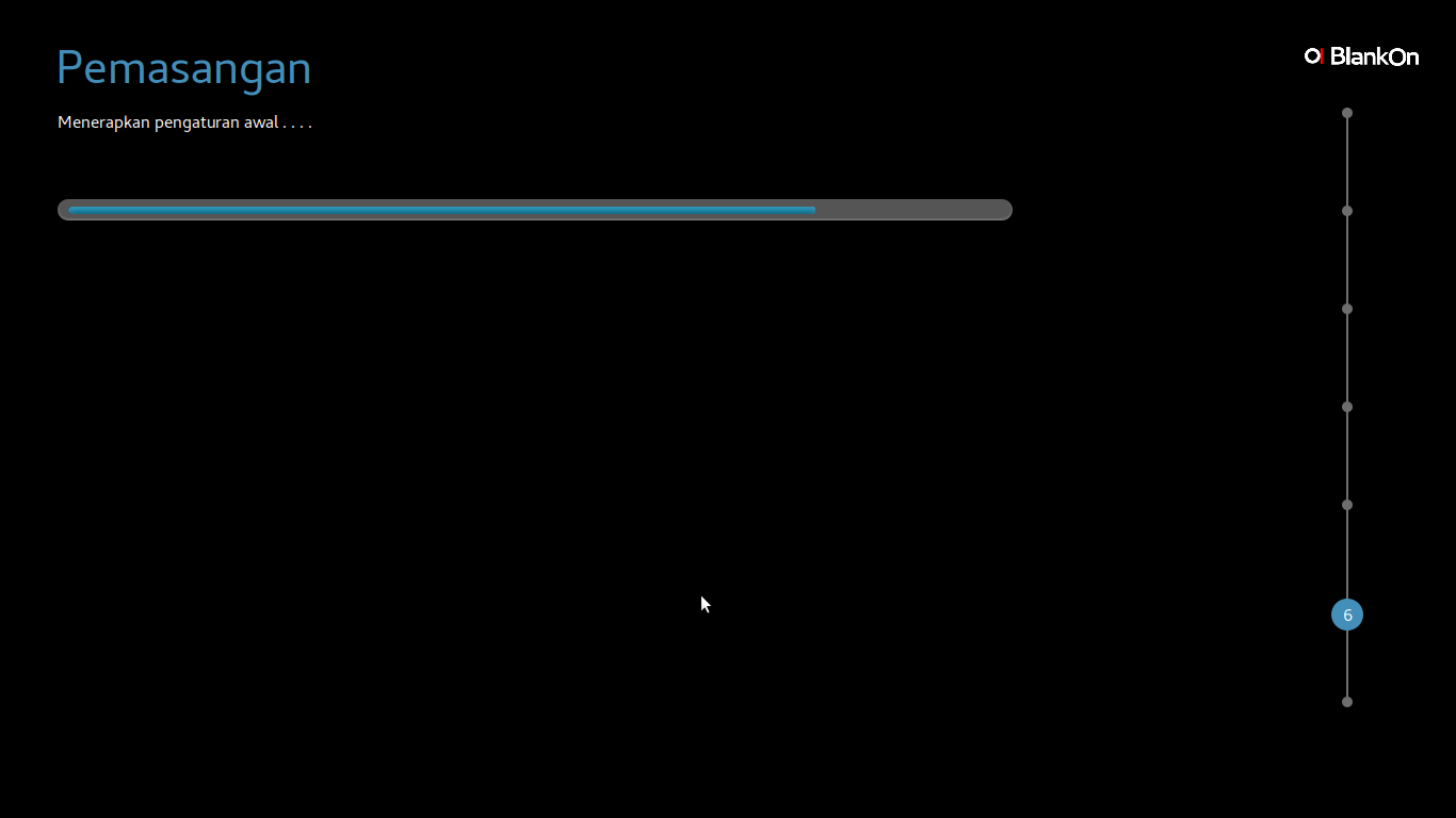 Ketika muncul tampilan proses Pemasangan BlankOn yang sedang berlangsung, tunggu beberapa saat hingga selesai.