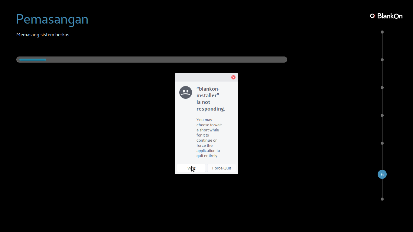 Bila pada saat proses pemasangan muncul kotak pesan blankon-installer is not responding, Anda tetap dapat melanjutkan pemasangan dengan memilih Wait.