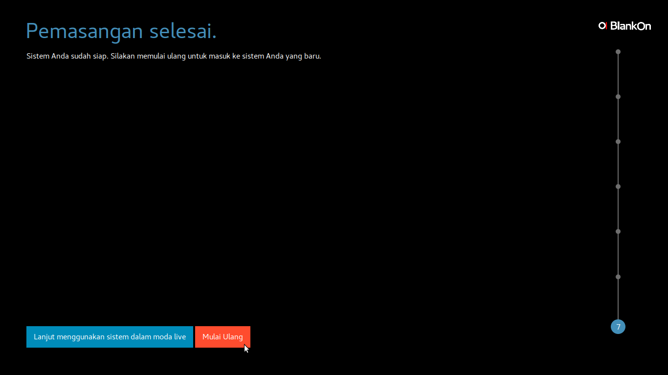 Setelah proses pemasangan berhasil maka akan muncul jendela berisi dua pilihan yaitu Lanjut menggunakan sistem dalam moda live atau Mula Ulang, klik salah satu dari kedua pilihan tersebut sesuai selera Anda.